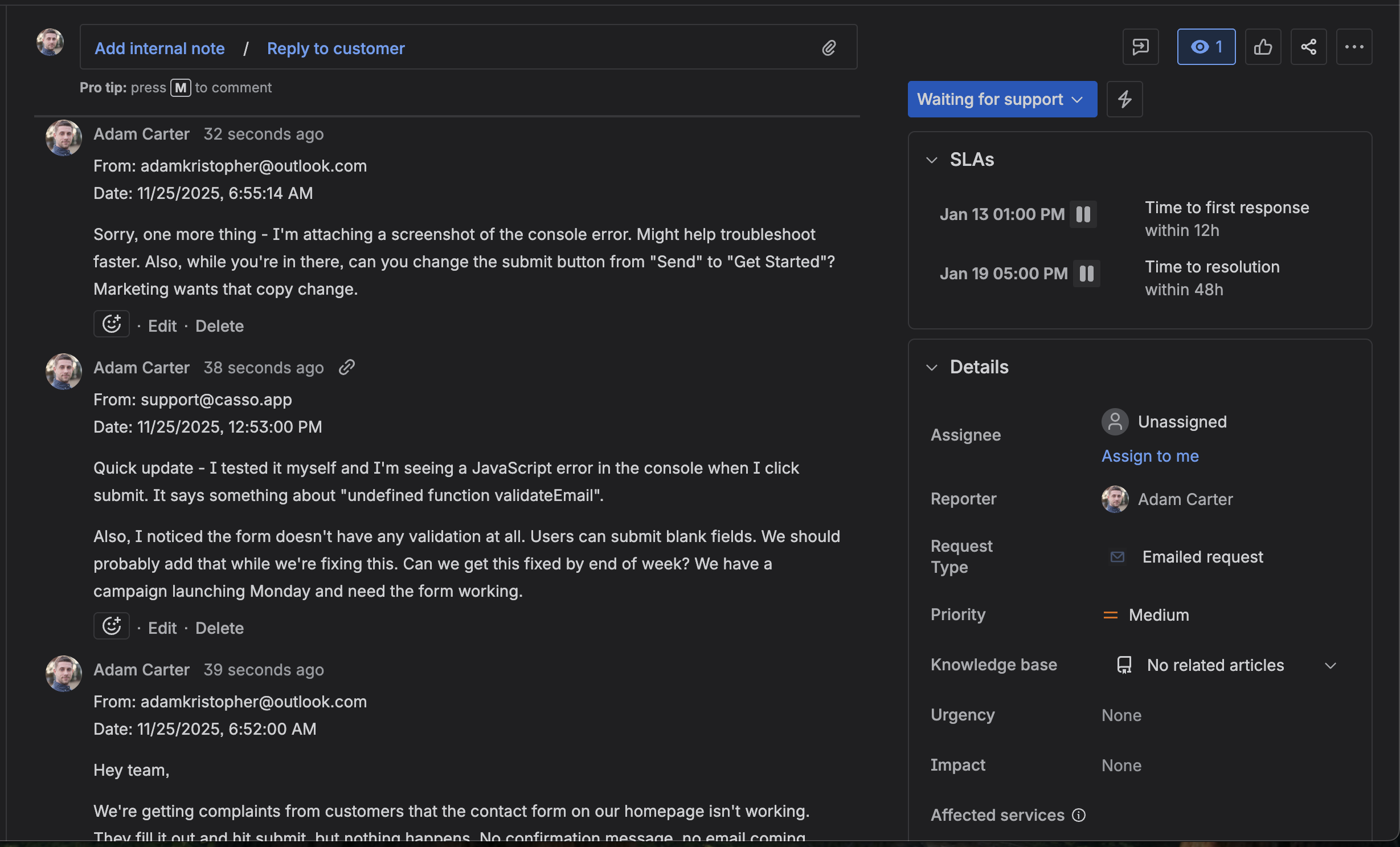 - Replies add to existing ticket (if threading works)